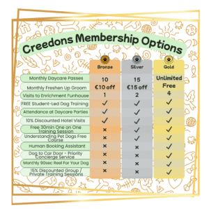 At Creedons Dog Care we pride ourselves on our highly educated training teams. Gold members can avail of 15% off both group training classes and one to one training sessions. *Not valid for vet referral behaviourist packages.
